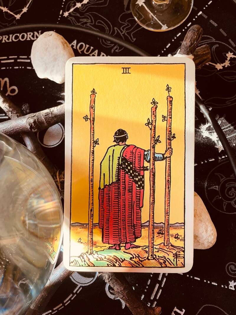Op de Drie van Staven zien we een figuur die op een klif staat en over de vlakte naar bergen in de verte staart. Vanop deze hoogte ziet hij alles zoals het is. Dit is een kaart van visie en vooruitzicht. Wanneer we meer willen zien, moeten we hoger klimmen. Door omhoog te klimmen, nemen we afstand van de situatie en daardoor kunnen we deze objectief benaderen en krijgen we meer inzicht.