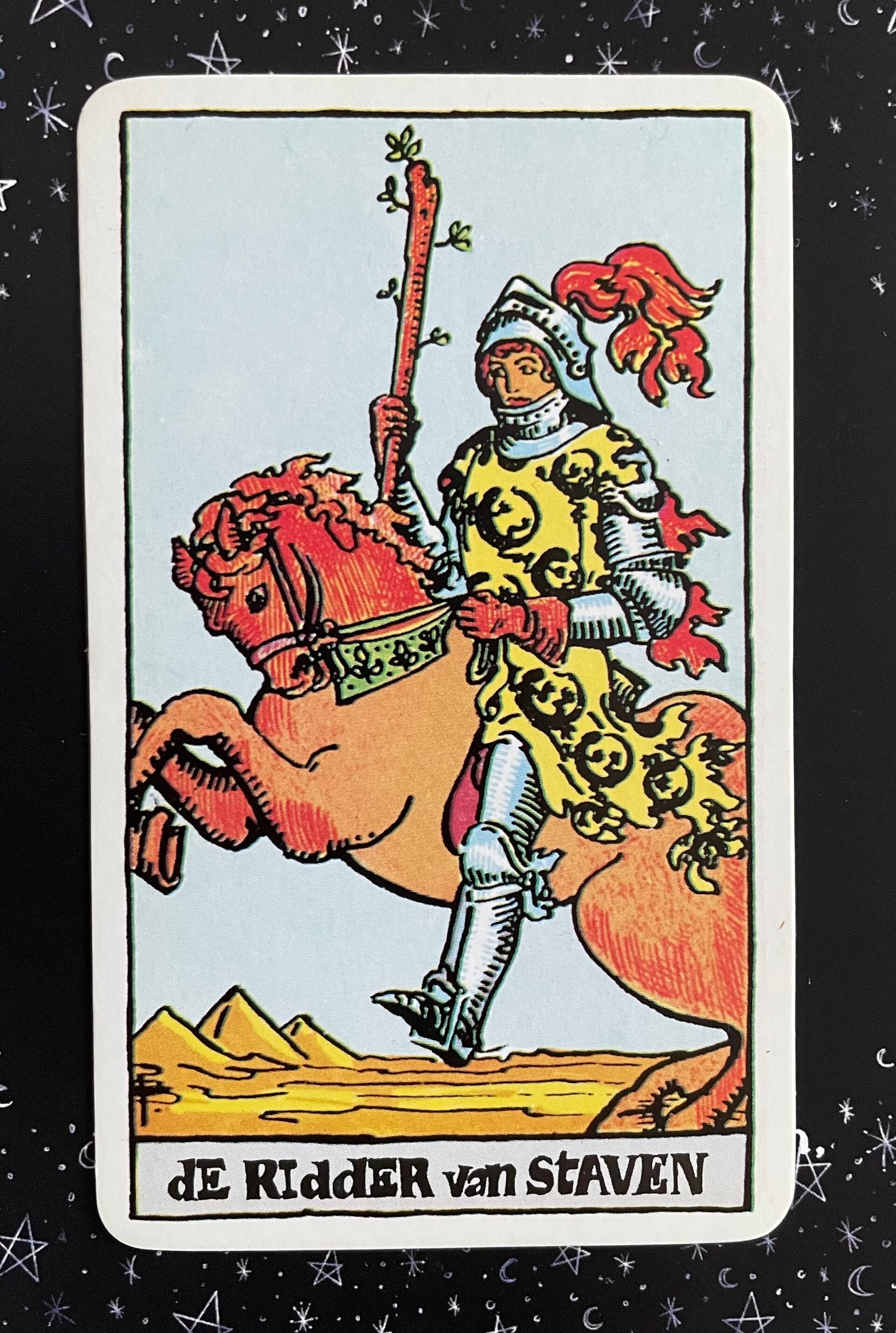 In een tarotreading geeft de Ridder van Staven blijk van een zelfverzekerde en gepassioneerde benadering die invloed heeft op de situatie. Deze energie kan een weerspiegeling zijn van jezelf, iemand anders, of de algehele sfeer om je heen. Vraag jezelf af: 'Draagt de energie van deze Ridder bij aan mijn situatie, of schaadt hij me?'
