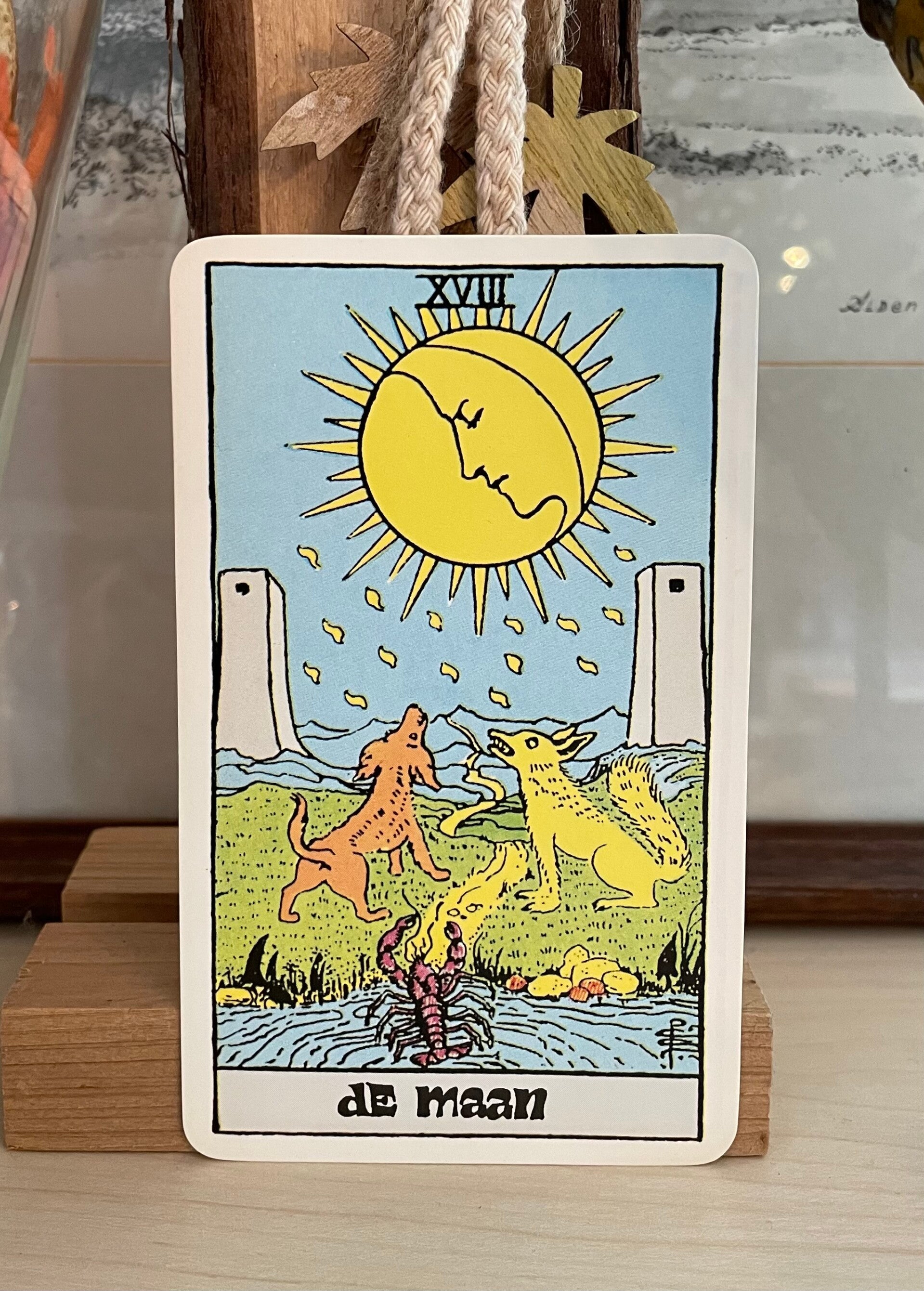 De Maan-kaart wordt in tarotlezingen vaak geassocieerd met gevoelens van angst, onrust en onzekerheid. Daarnaast staat kaart 18 symbool voor illusie en verwarring. In het zachte maanlicht kun je gemakkelijk de weg kwijtraken. Wees alert en laat je niet misleiden door bedrog of valse overtuigingen. Soms wijst de Maan erop dat je jezelf wat verloren voelt en doelloos ronddwaalt. Het kan een uitnodiging zijn om je focus terug te vinden en met helderheid en doelgerichtheid je pad te hervatten.