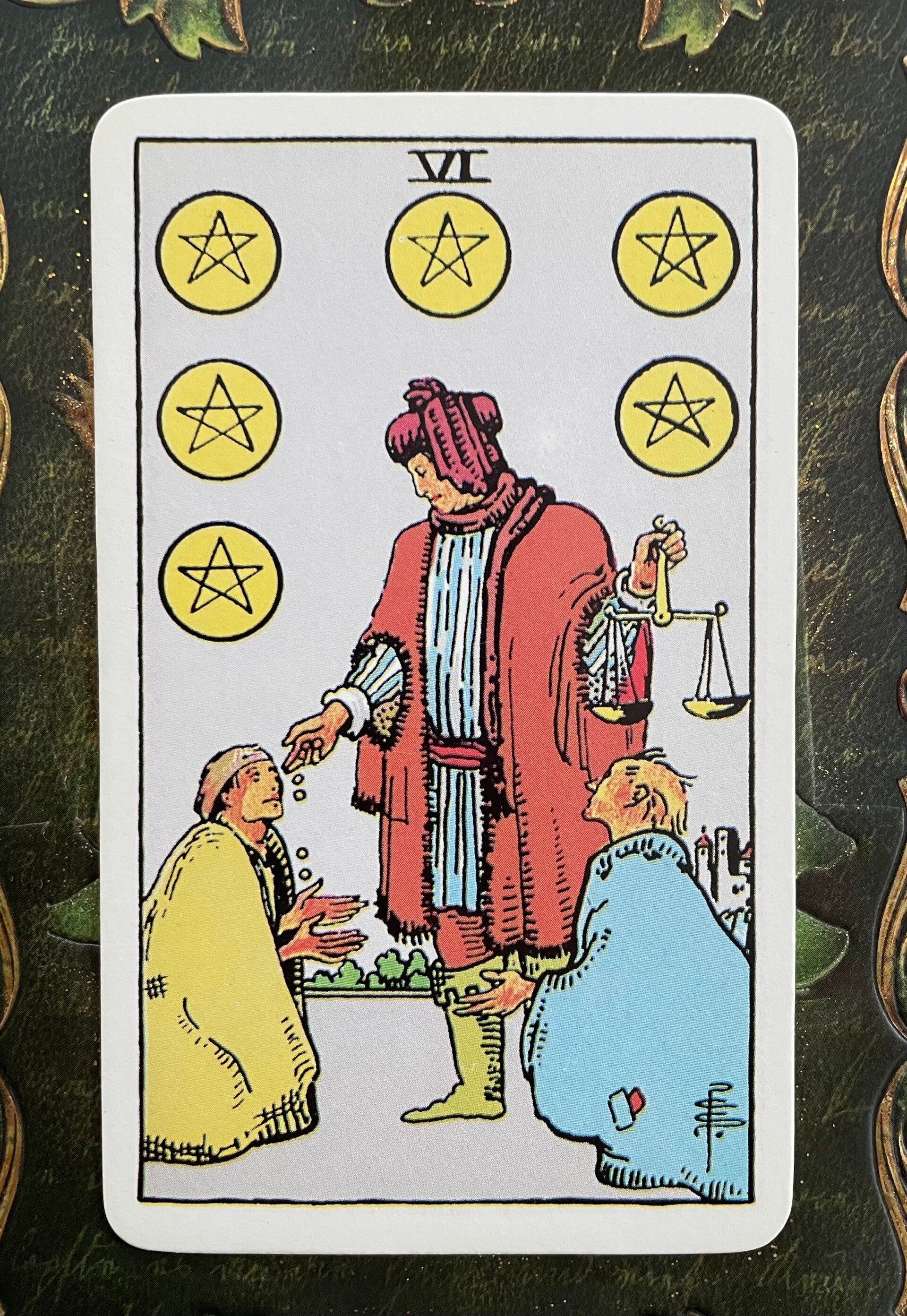 In tarot readings nodigt de Zes van Pentagrammen je uit om grondig na te denken over de betekenis van 'bezit', zowel op materieel vlak (middelen) als immaterieel (kennis, macht, liefde). Je kunt je aan de ene of de andere kant van deze kwestie bevinden, maar deze kaart vraagt je om je standpunt te heroverwegen. Denk aan de succesvolle zakenman die plotseling failliet gaat of aan de tirannieke invalide die zijn invloed uitoefent vanuit zijn kwetsbaarheid. Overweeg ook de lerares die waardevolle lessen leert van haar leerlingen en de ouder die controle probeert te winnen door financiële steun te bieden.